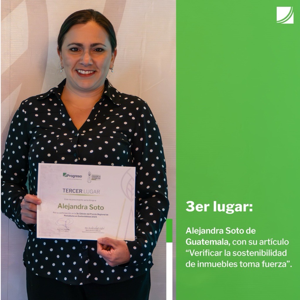 3. Tercer Lugar: Alejandra Soto (Guatemala), de Revista Inmobiliaria, con el artículo «Verificar la sostenibilidad de inmuebles toma fuerza».