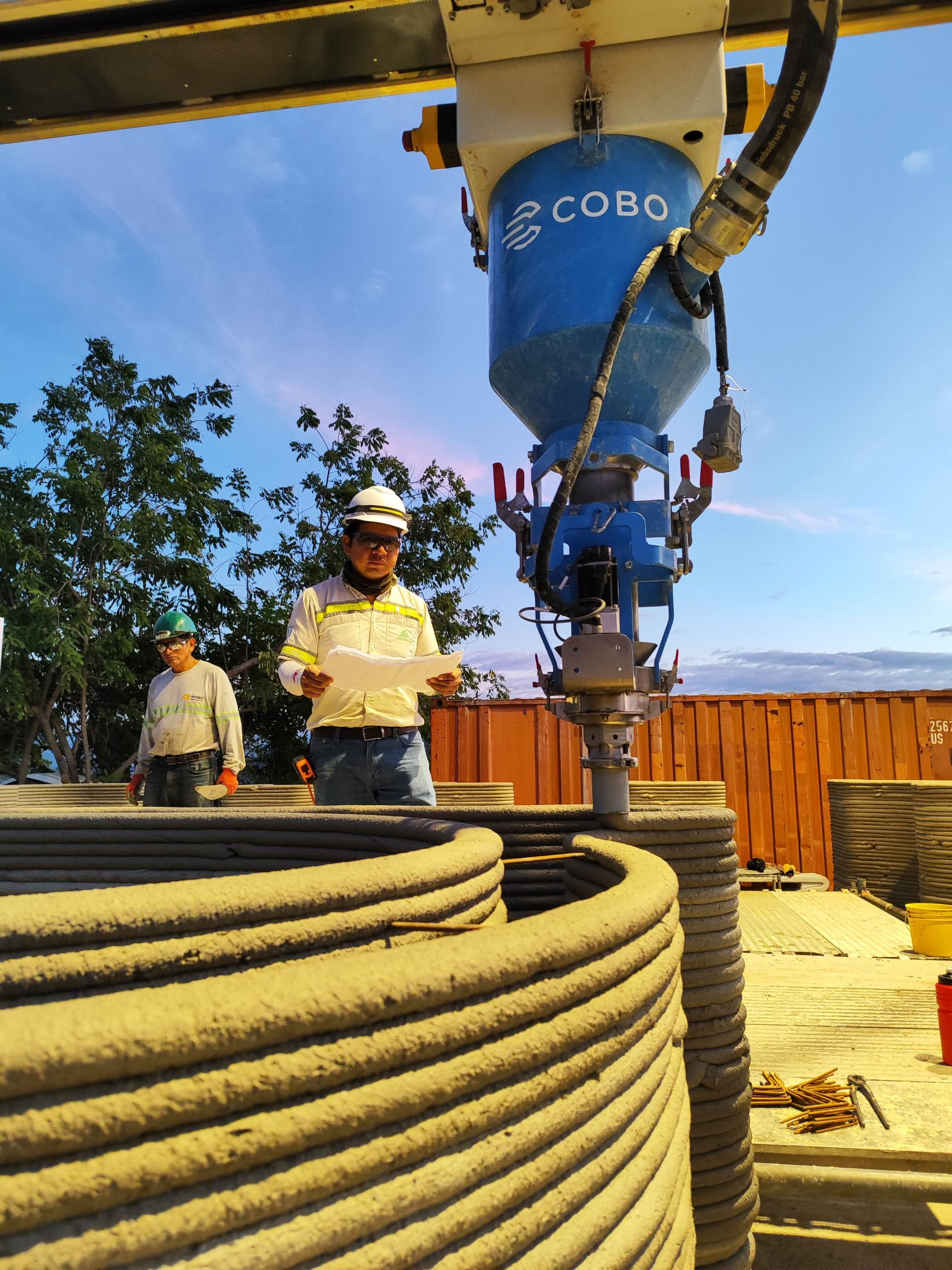 Para la ejecución del proyecto, se empleó una impresora 3D modelo BOD-2 de COBOD. La estructura completa fue impresa en tan solo 32 horas de tiempo efectivo, logrando altos estándares de resistencia sísmica y diseño optimizado gracias al uso de una losa de concreto maciza y muros curvos.
